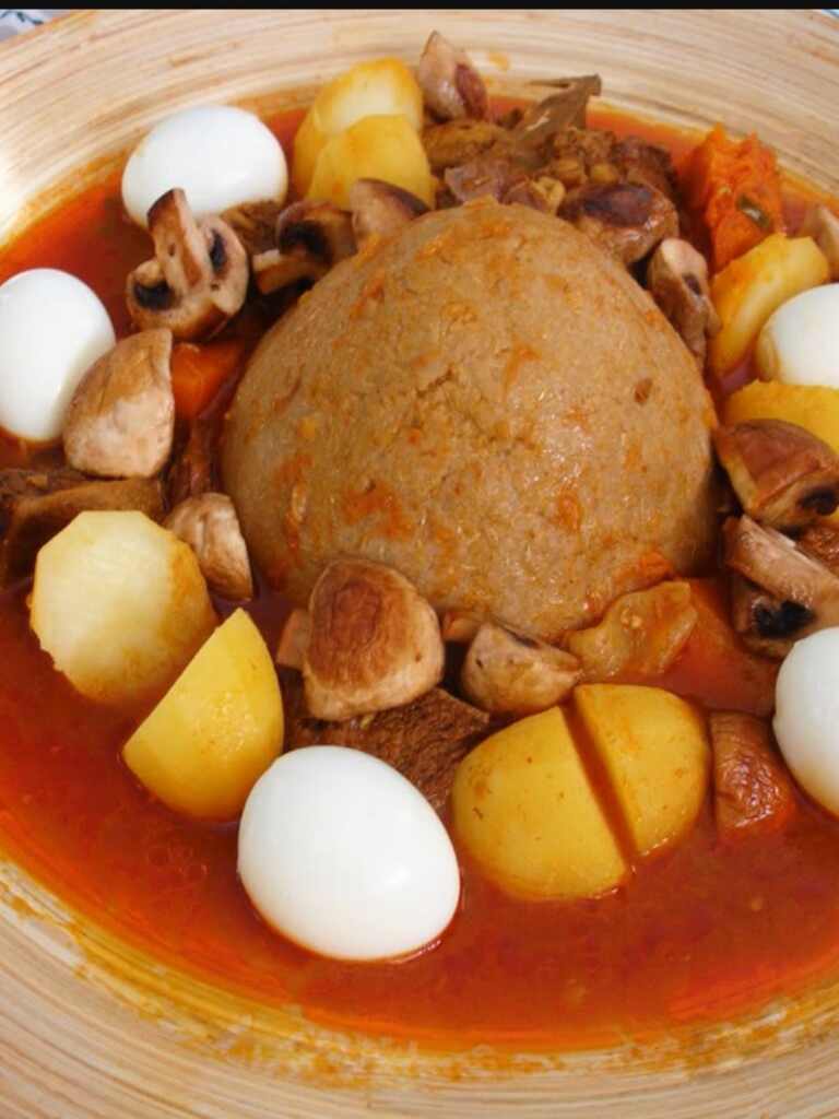 Bazeen is a traditional Libyan dish that embodies the country’s Bedouin heritage and communal dining culture. It’s a hearty and symbolic meal made from barley flour dough, shaped into a firm dome, and typically served in the center of a large communal bowl. Surrounding the dough is a rich and flavorful stew made of tomatoes, lamb or beef, potatoes, boiled eggs, and aromatic spices like cayenne and turmeric.