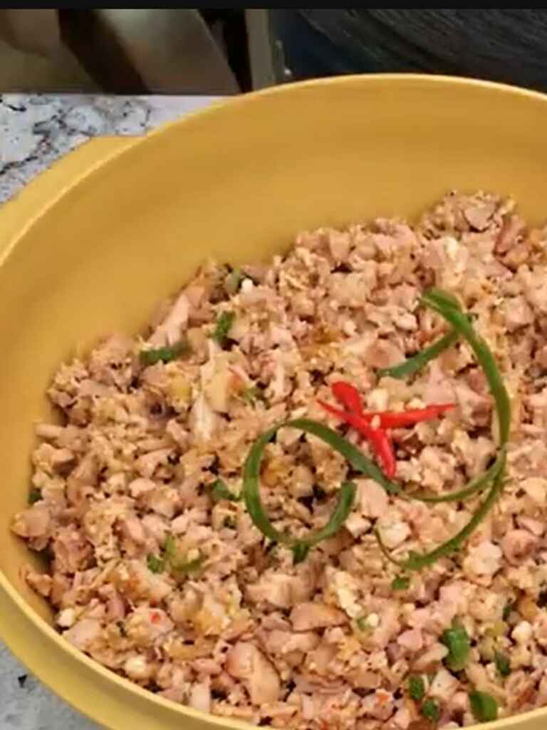 - In a big bowl, put the diced chicken and add the diced yellow and green onions. Sprinkle some salt. Add 2 tablespoons of lemon juice, a tablespoon of calamansi juice, and a tablespoon of lemon China. Mix evenly.